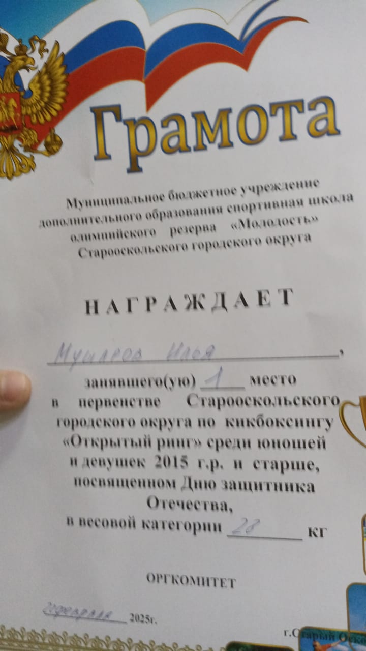 Мушаров Илья занял 1 место в первенстве Старооскольского городского округа по кикбоксингу "открытый ринг" среди юношей и девушек, в весовой категории 28 кг. Илья большой молодец, поздравляем!